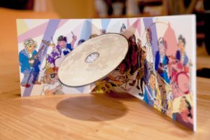会場となった月見ルと、ニシニカリシテでもおなじみ子ども盆踊りの詞「そろてうたえば 月が出る」にちなんで、ケースを開くとみんなが歌っている絵の前にCDがポップアップします。